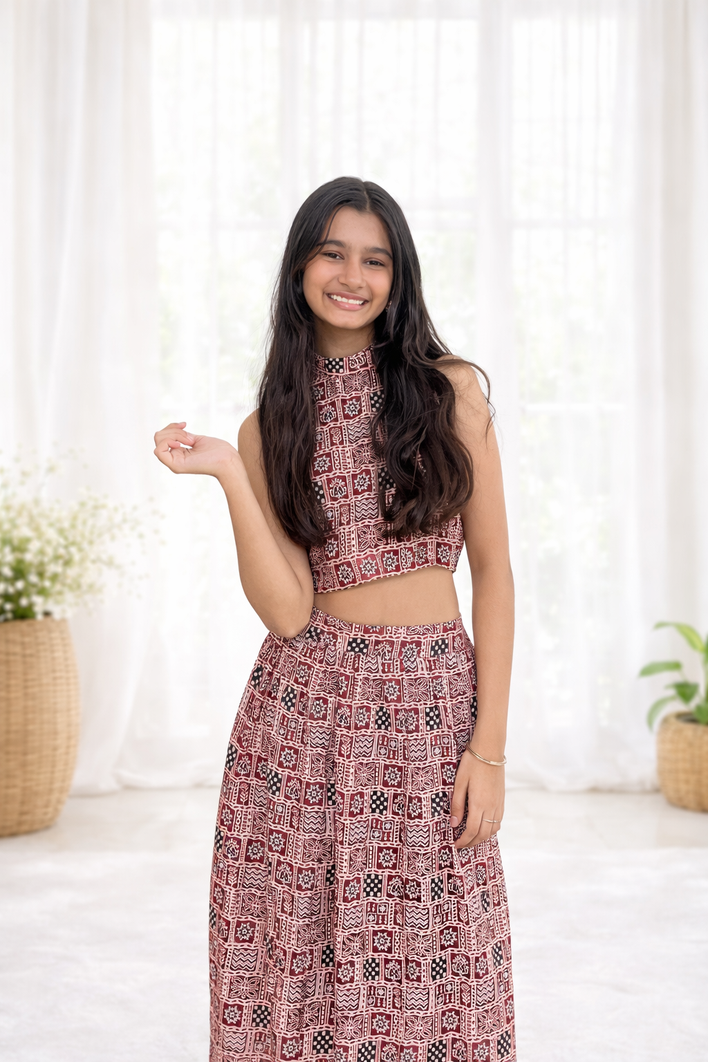 Step into effortless elegance with this beautifully crafted co-ord set, designed for modern women who love a blend of tradition and style. Featuring a sleeveless high-neck crop top with intricate ethnic-inspired prints, paired with a flowy matching skirt and matching duppata this outfit creates a graceful and flattering silhouette.