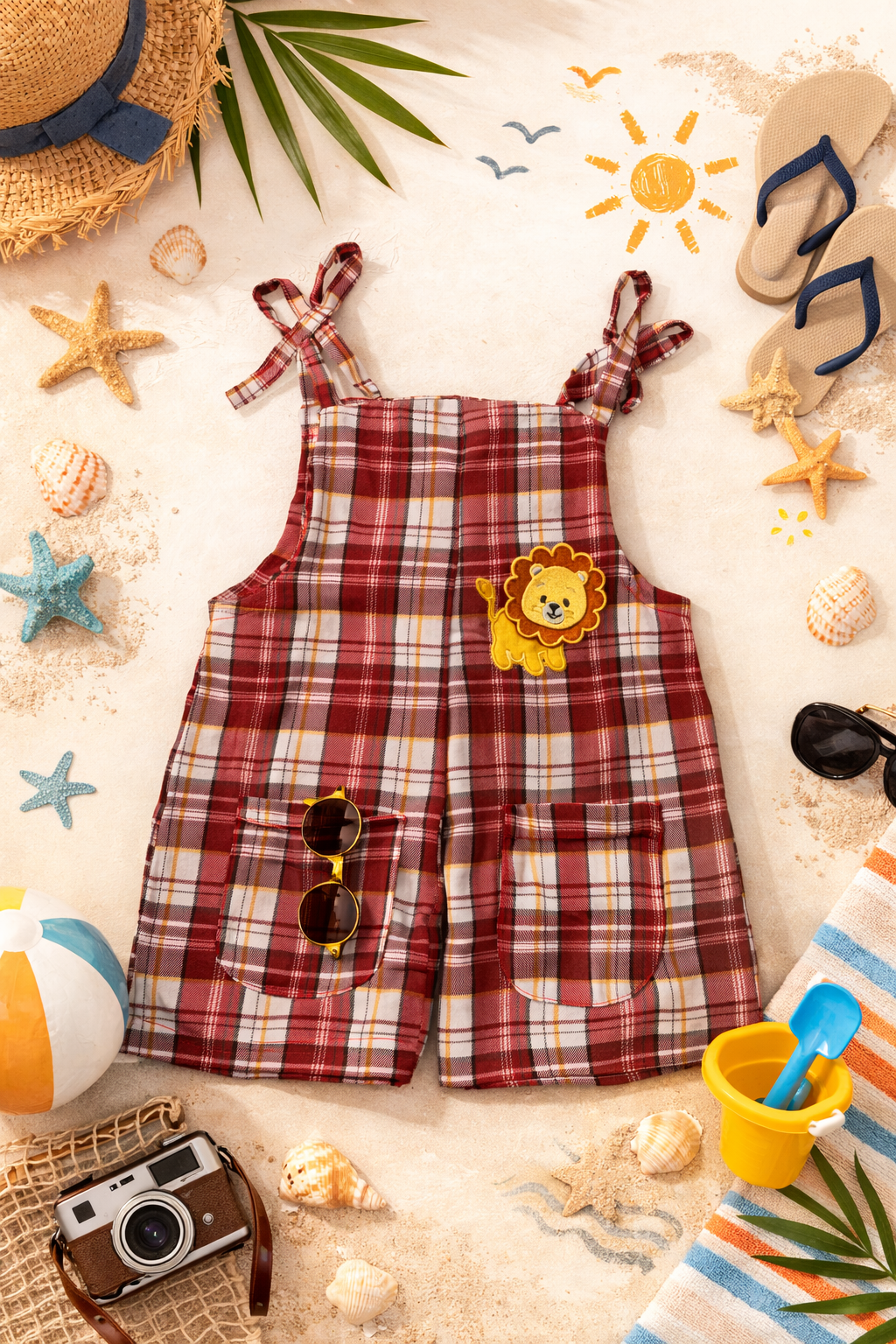 This adorable red , blue plaid dungaree dress is designed for comfort and charm. Featuring a cute lion embroidery patch on the front and stylish tie-up shoulder straps, this outfit is perfect for playful days and picture-perfect moments.