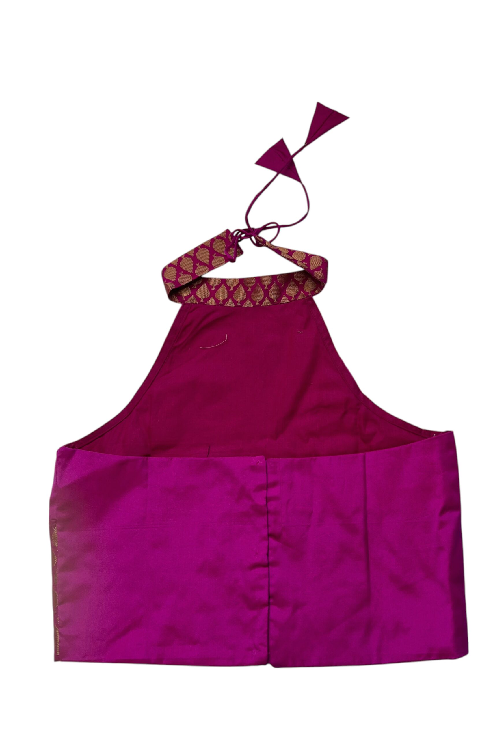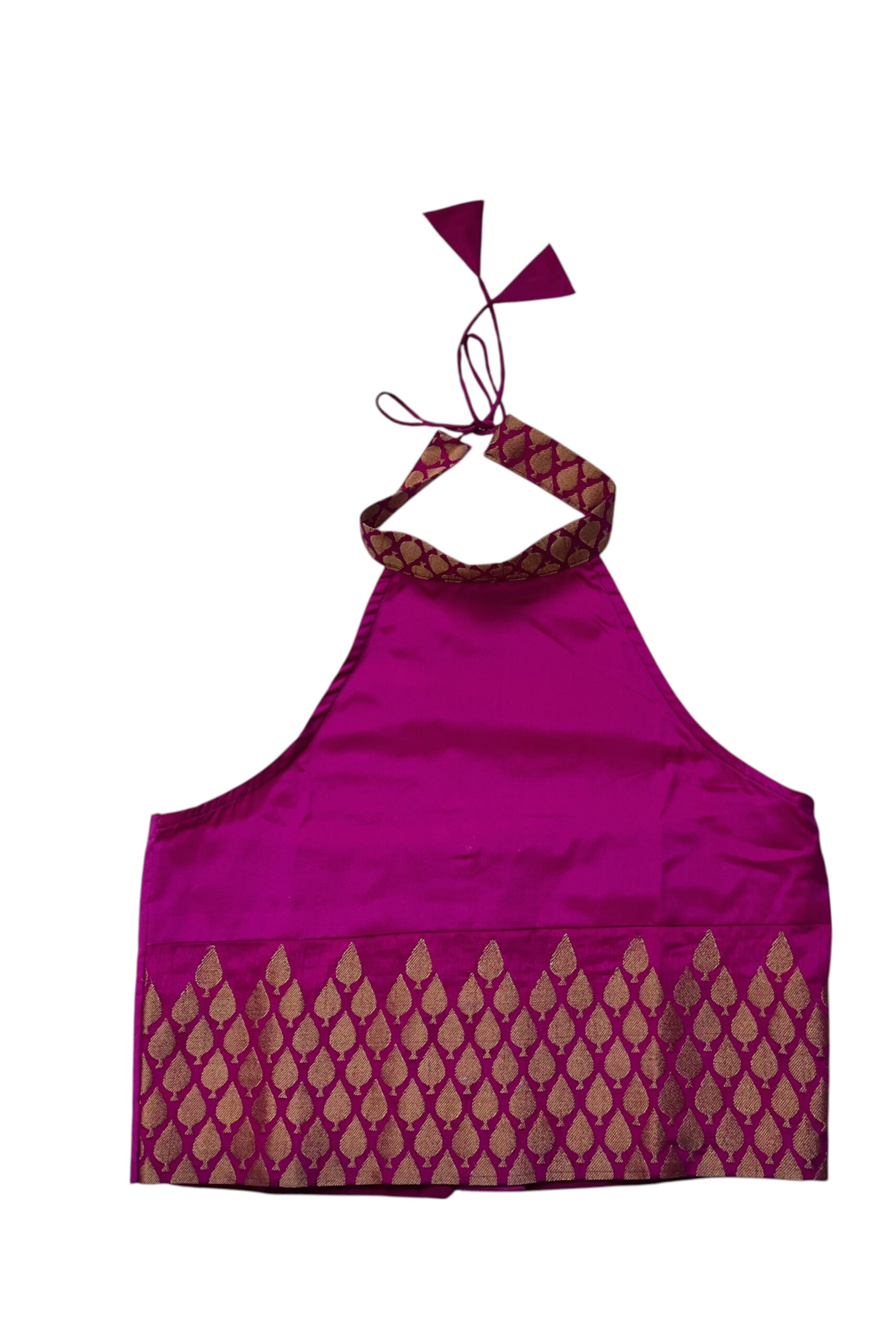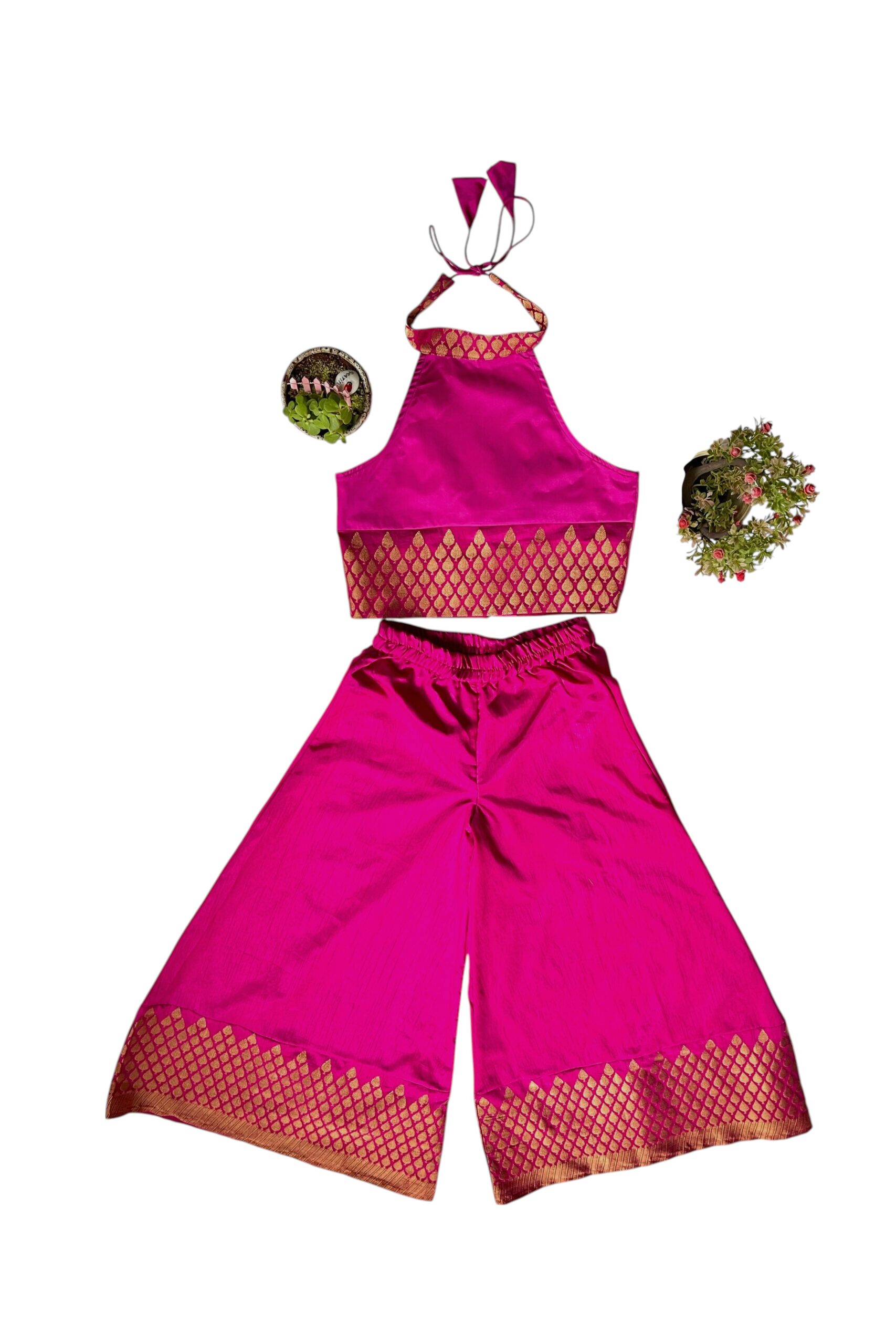 Description: Make a vibrant style statement with this trendy fuchsia pink Indo-western set, blending ethnic charm with modern flair perfect for festive celebrations, mehendi, haldi, or sangeet functions. Top (Crop Top): Halter-neck with tie-up detail at the back. Made from rich silk blend fabric , Bold fuchsia base with intricate gold woven pattern on the bust and neckline. Open back design for a chic, contemporary look. Bottom (Palazzo Pants): Wide-legged palazzo pants with an elastic waistband for comfort . The hem of the pants is decorated with the same golden brocade diamond pattern as the top, creating a cohesive and elegant set. Detailing: Gold woven brocade pattern at the hem, matching the top for a coordinated finish.