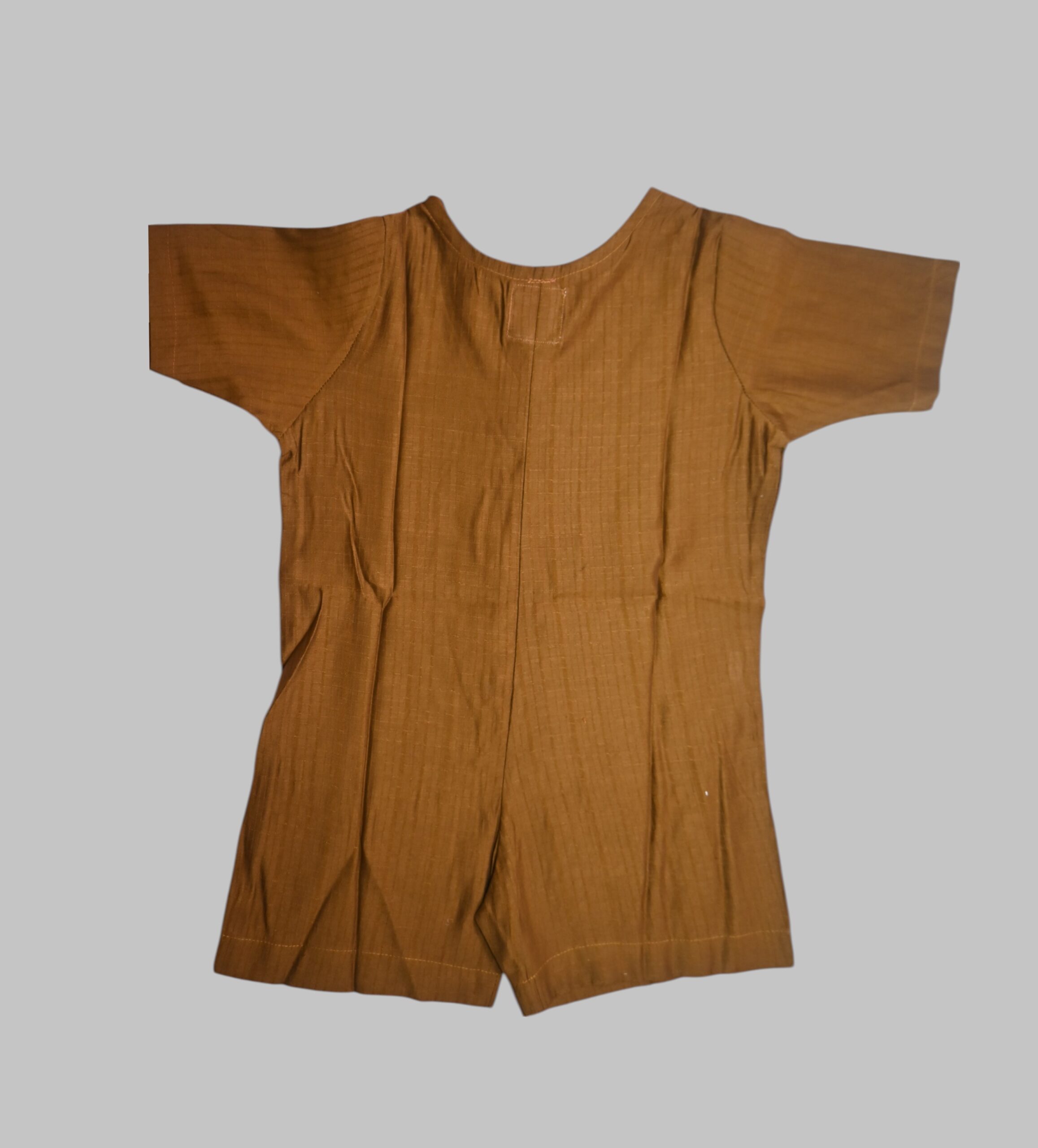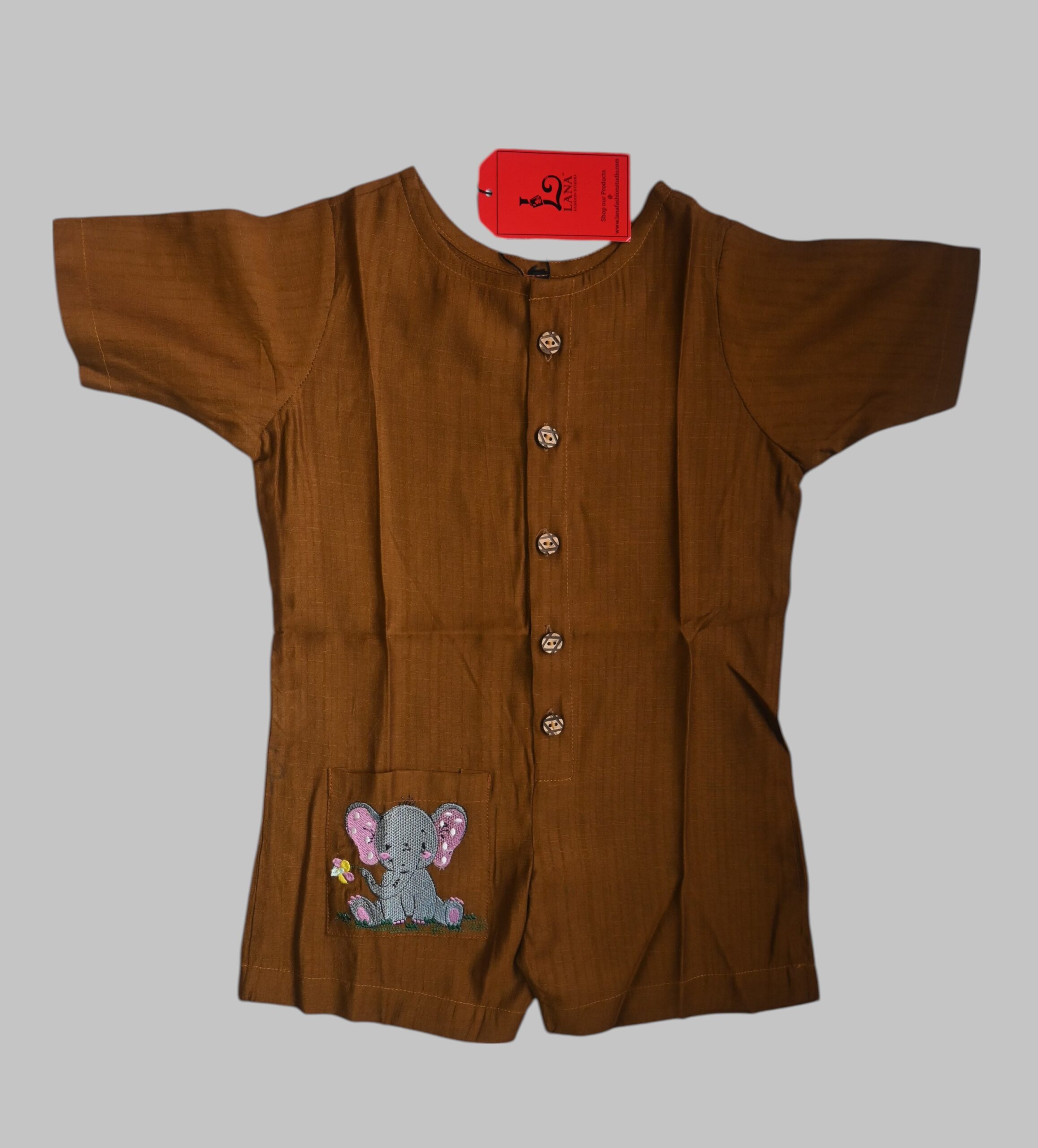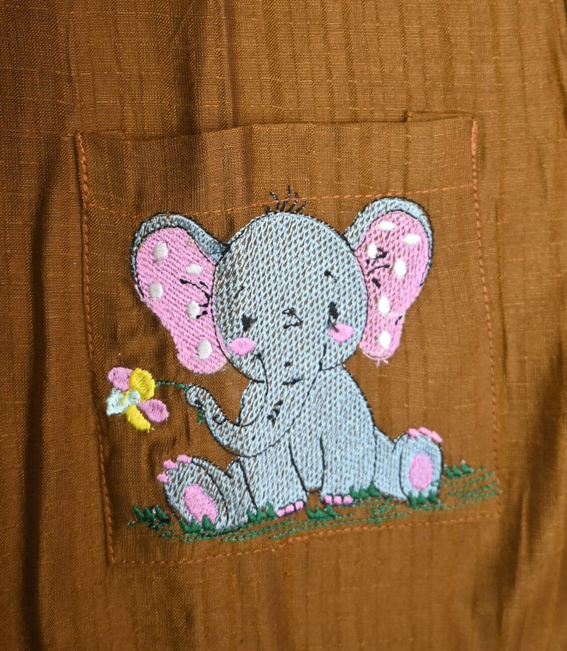 The Jumpsuit has short sleeves and short legs, resembling a casual, one-piece outfit. A notable design element is the embroidered patch on the lower left side, depicting a cute, cartoon-like elephant.