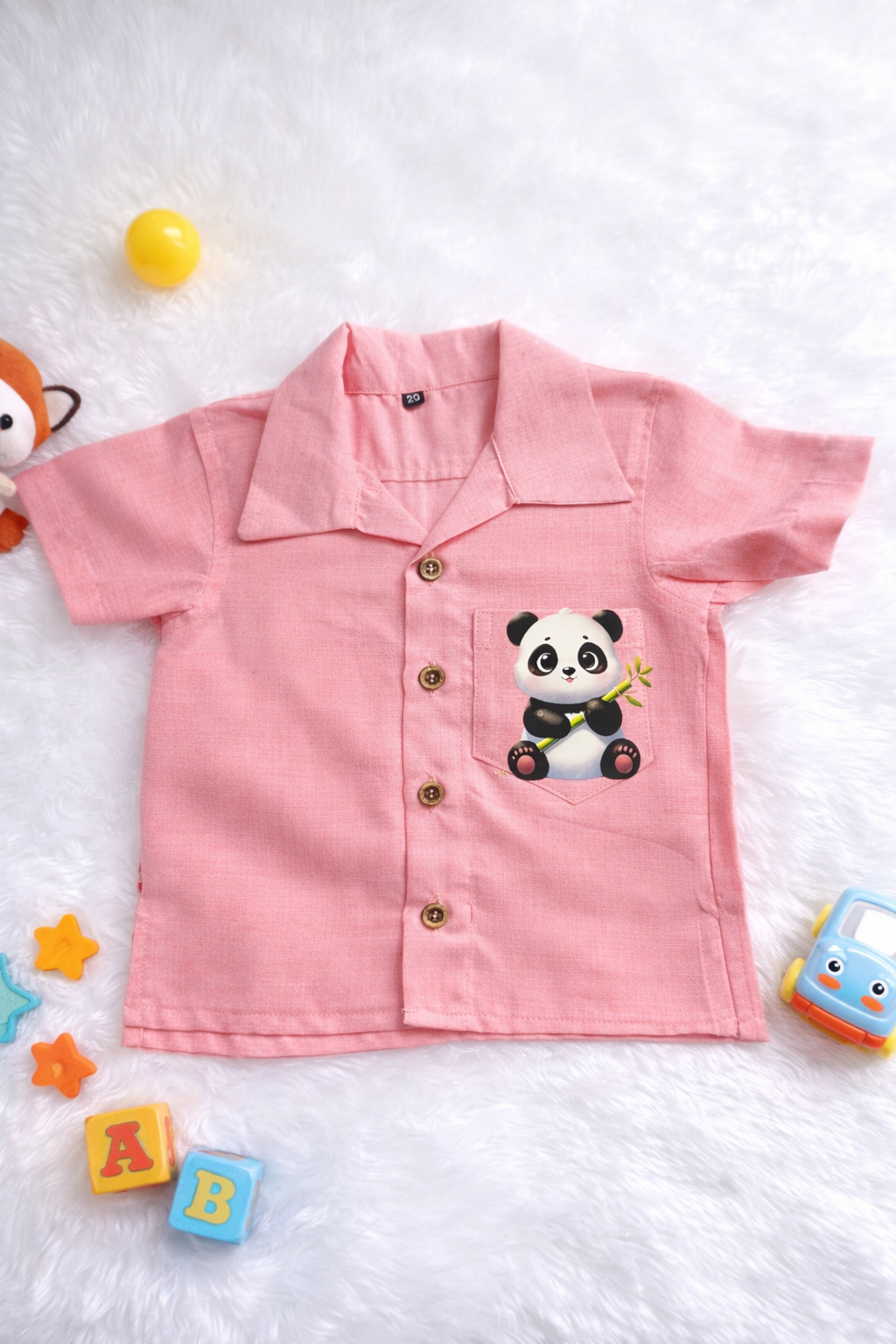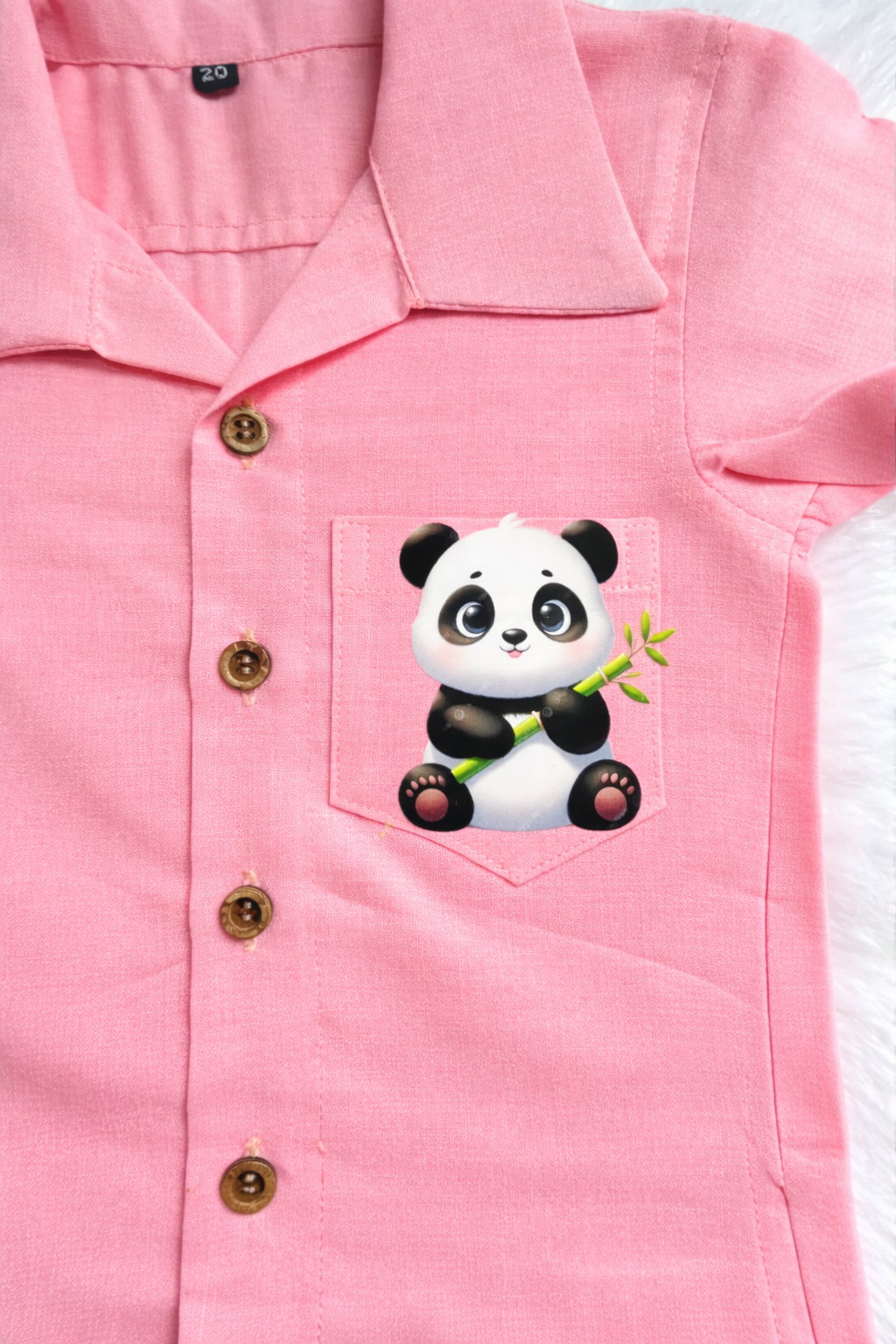 This is a charming and playful children’s button-down shirt, perfect for casual outings or a fun summer look. The soft pink hue combined with the adorable panda graphic makes it a standout piece for any little one’s wardrobe.