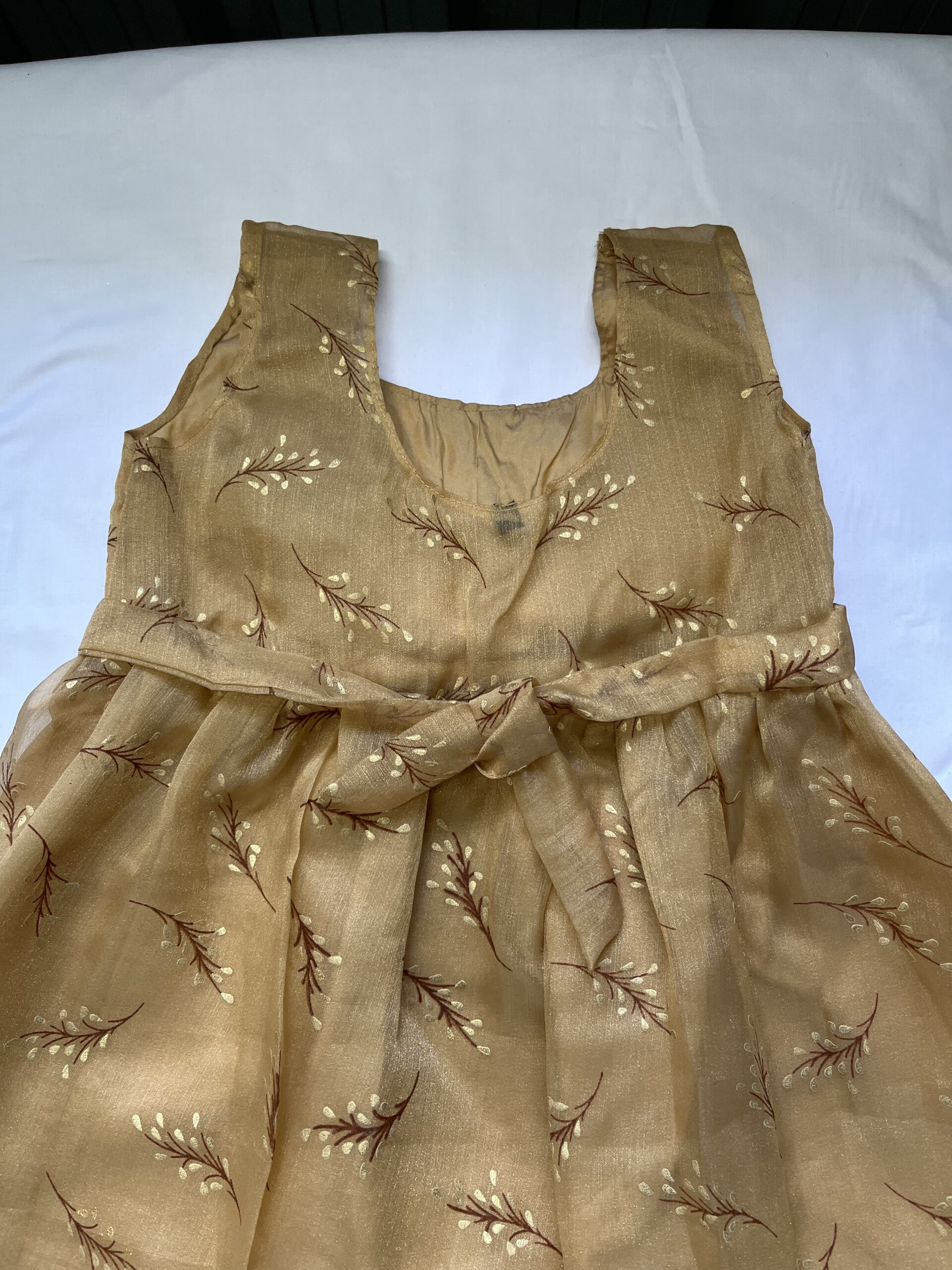 Print: Subtle all-over branch/leaf motifs in dark brown and beige, giving a natural and gentle look