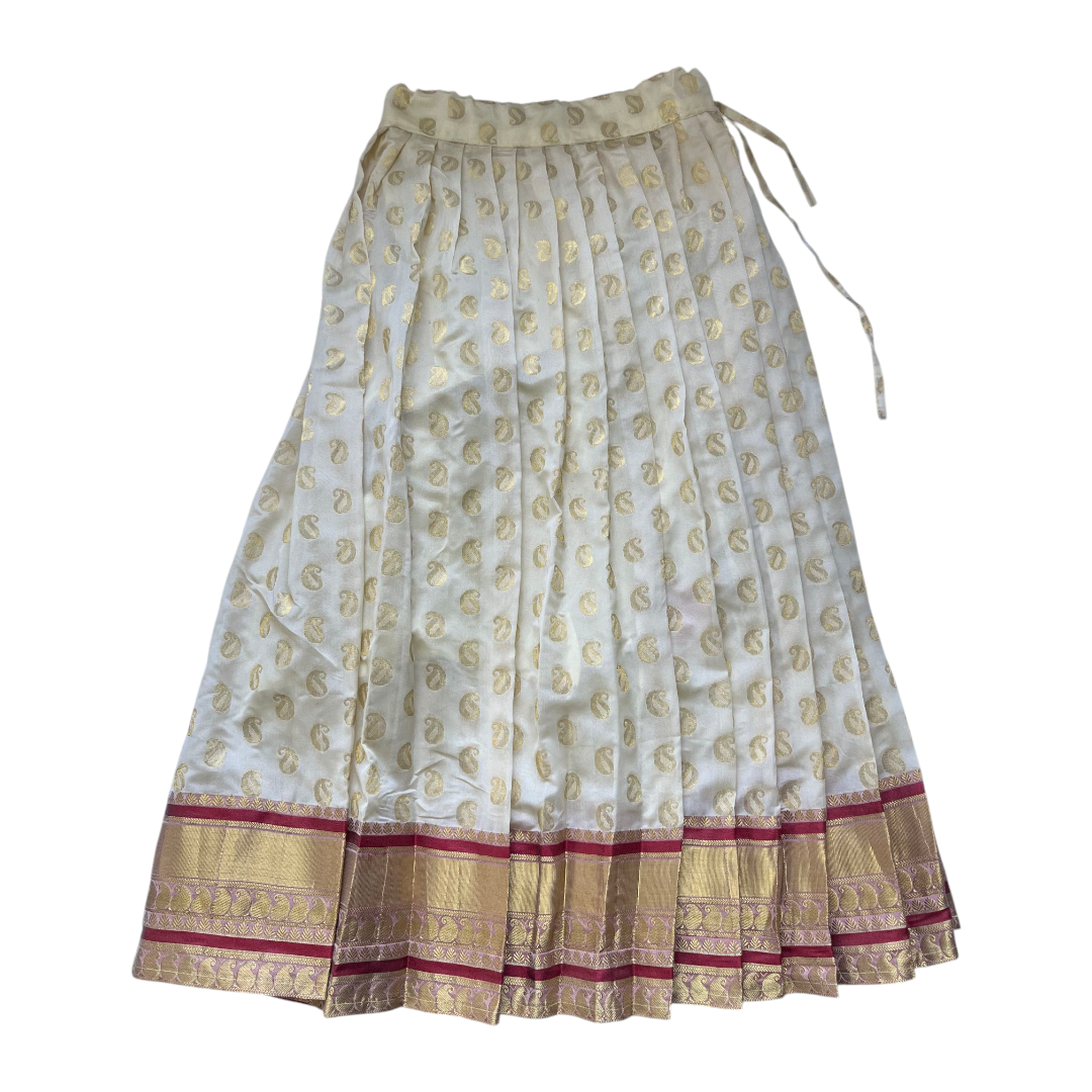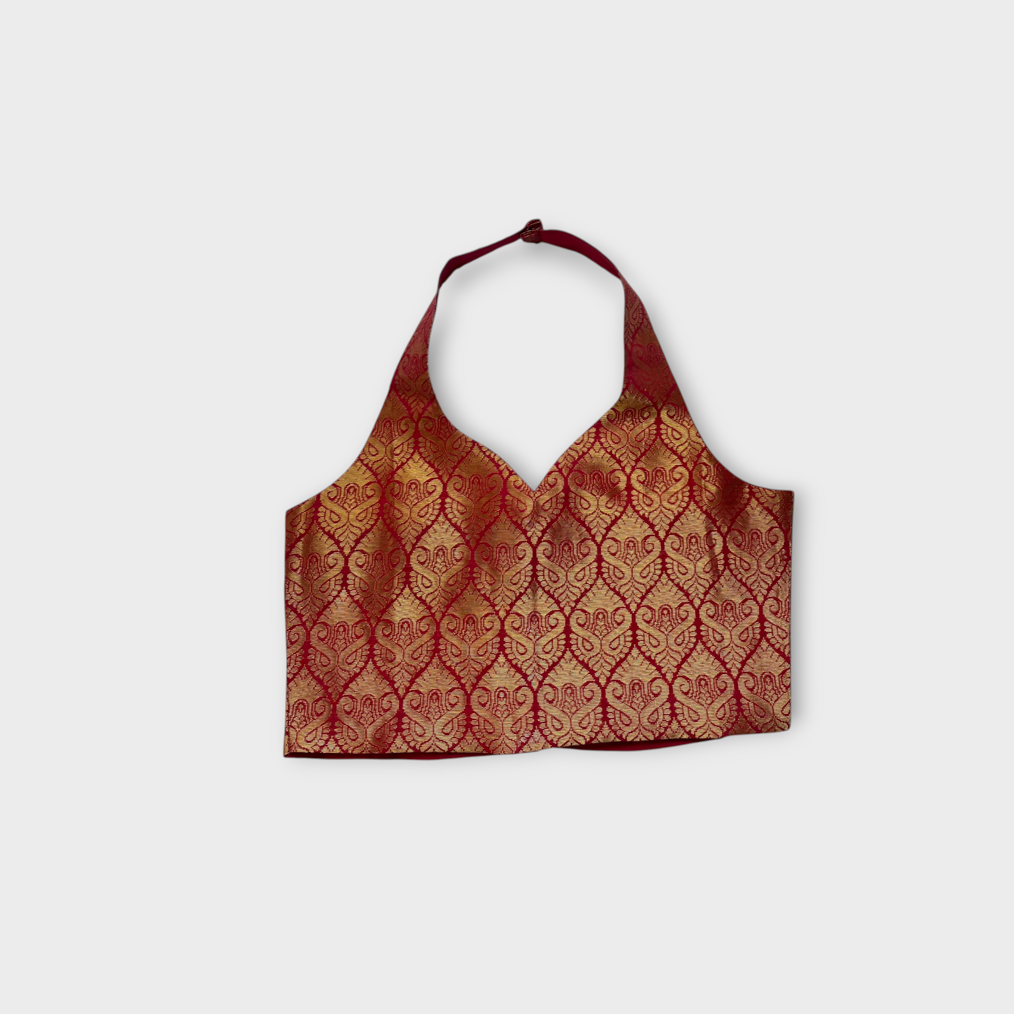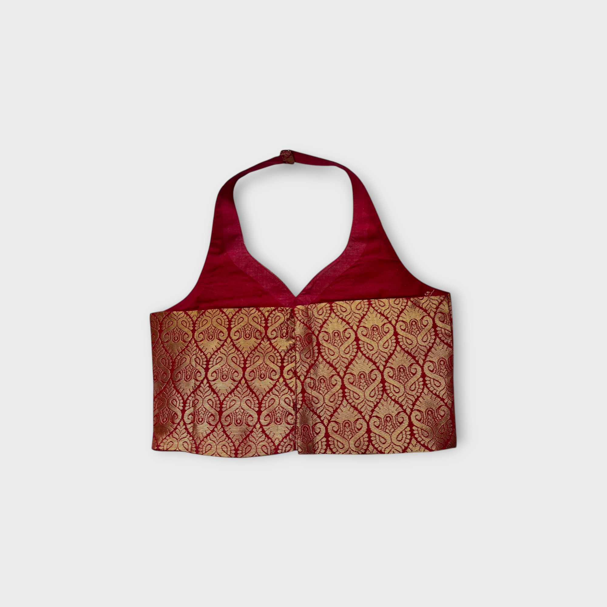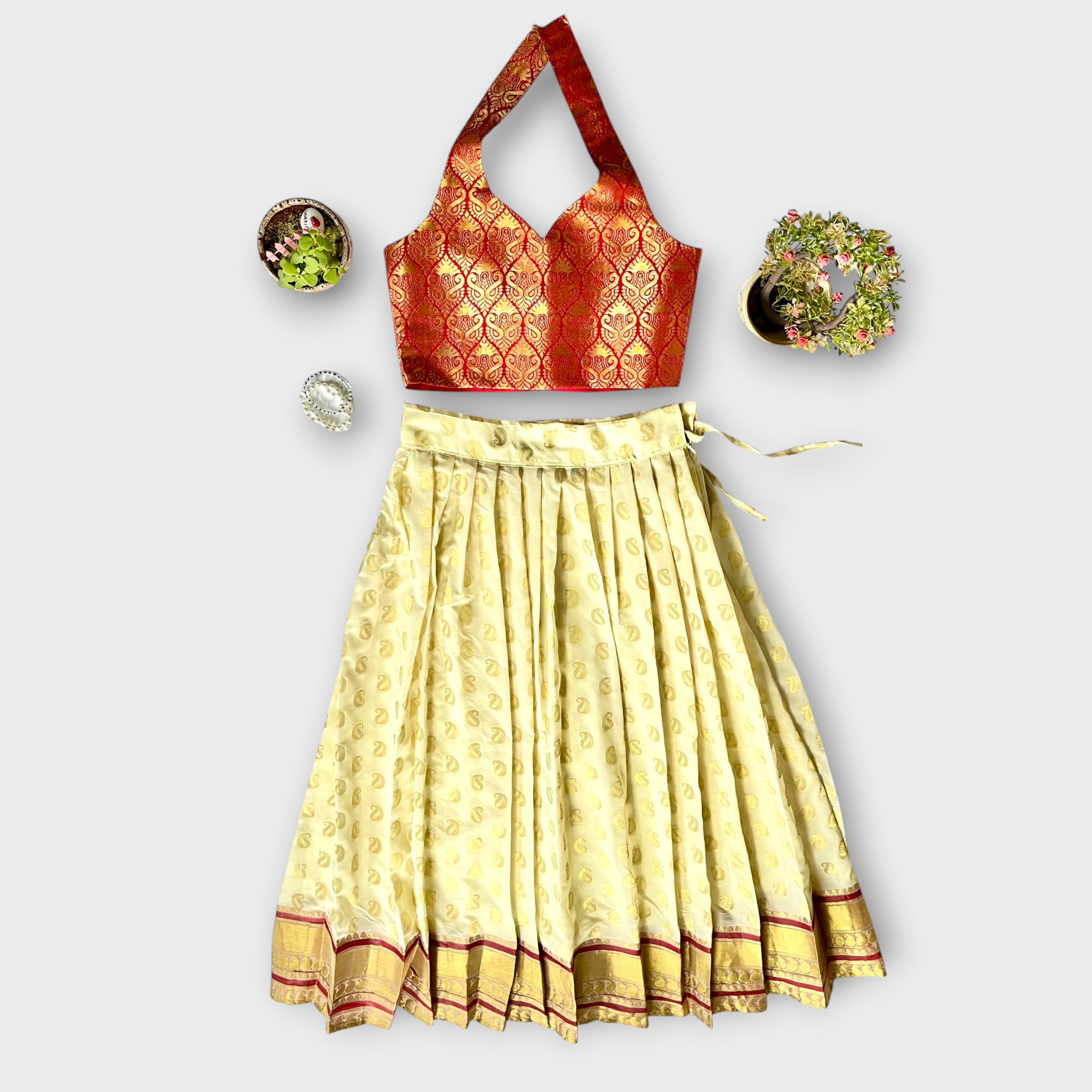 Description: Step into timeless elegance with this beautifully handcrafted lehenga choli set, perfect for festive occasions, weddings, and traditional functions. Choli (Blouse): The top is a halter-neck style blouse made from rich red brocade fabric, adorned with golden zari motifs in a traditional paisley and floral design. The neckline has a deep cut, adding a modern touch to the ethnic attire. Lehenga (Skirt): The skirt is a soft off white color with golden motifs throughout. It features pleats for added volume and movement. The hem is detailed with an ornate border in red and gold, complementing the blouse perfectly. It also includes side tie-up strings for adjustment.